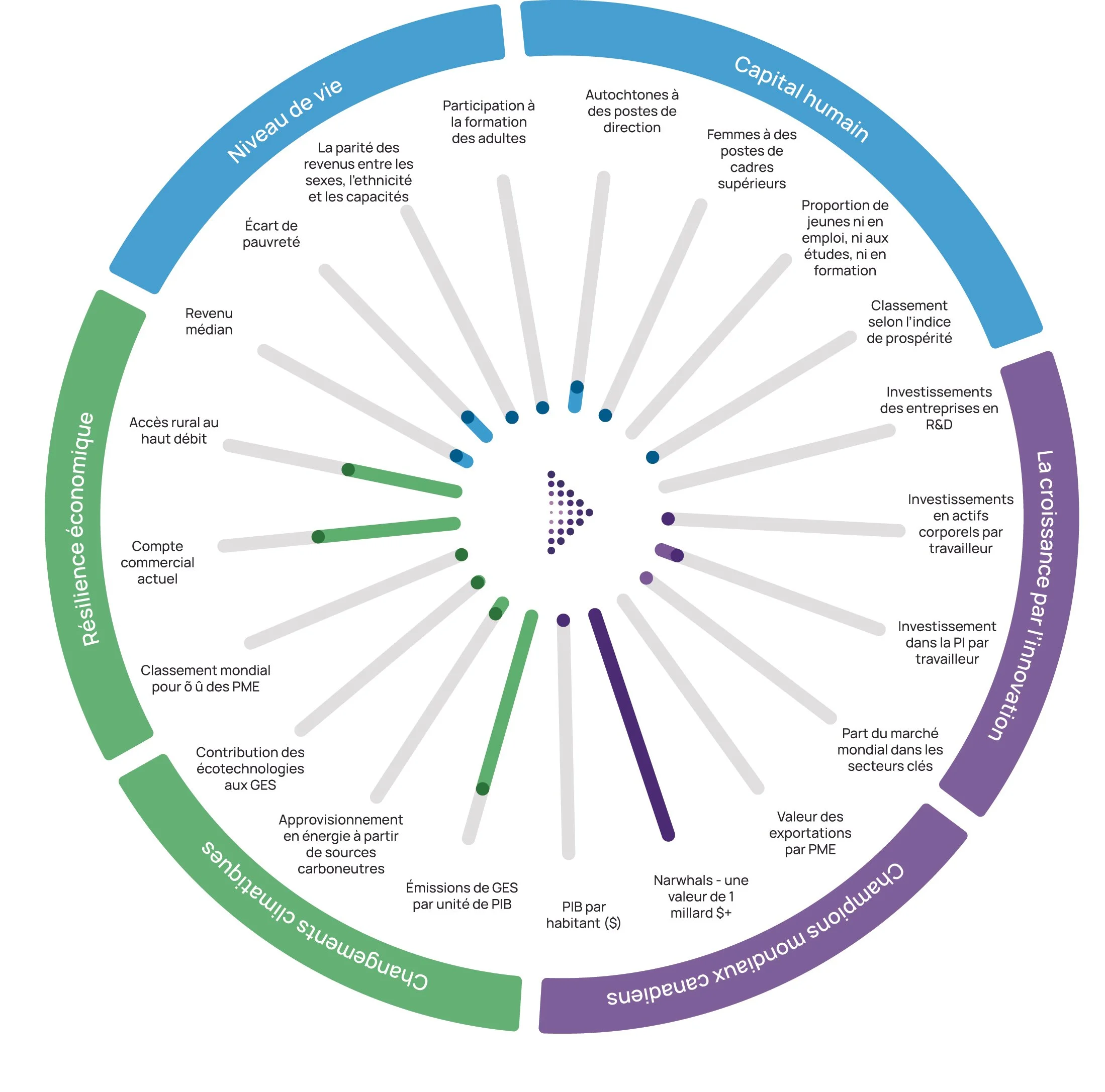 Un deuxième pilier clé de notre Tableau de bord détermine dans quelle mesure nos entreprises atteignent une envergure mondiale grâce à l’innovation et à un investissement soutenu, et dans quelle mesure nous réussissons à créer des champions mondiaux formés au Canada.