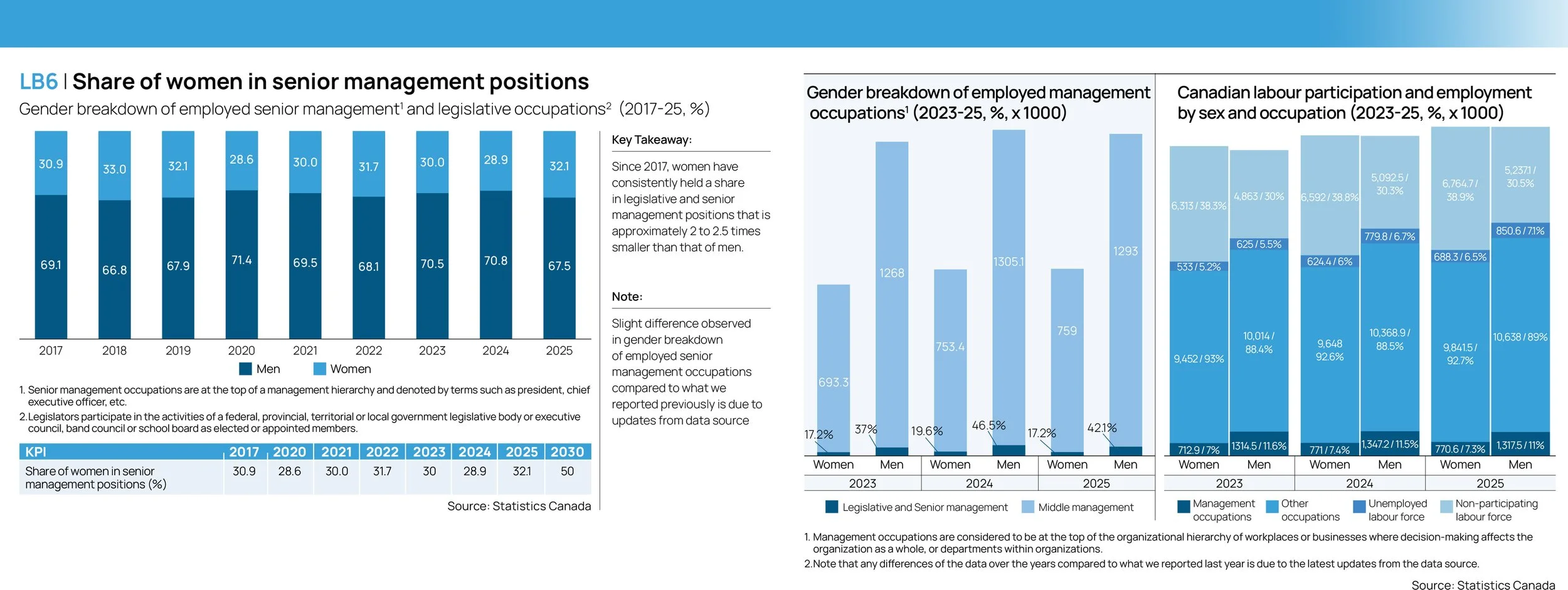 Since 2017, women have consistently held a share in legislative and senior management positions that is approximately 2 to 2.5 times smaller than that of men.