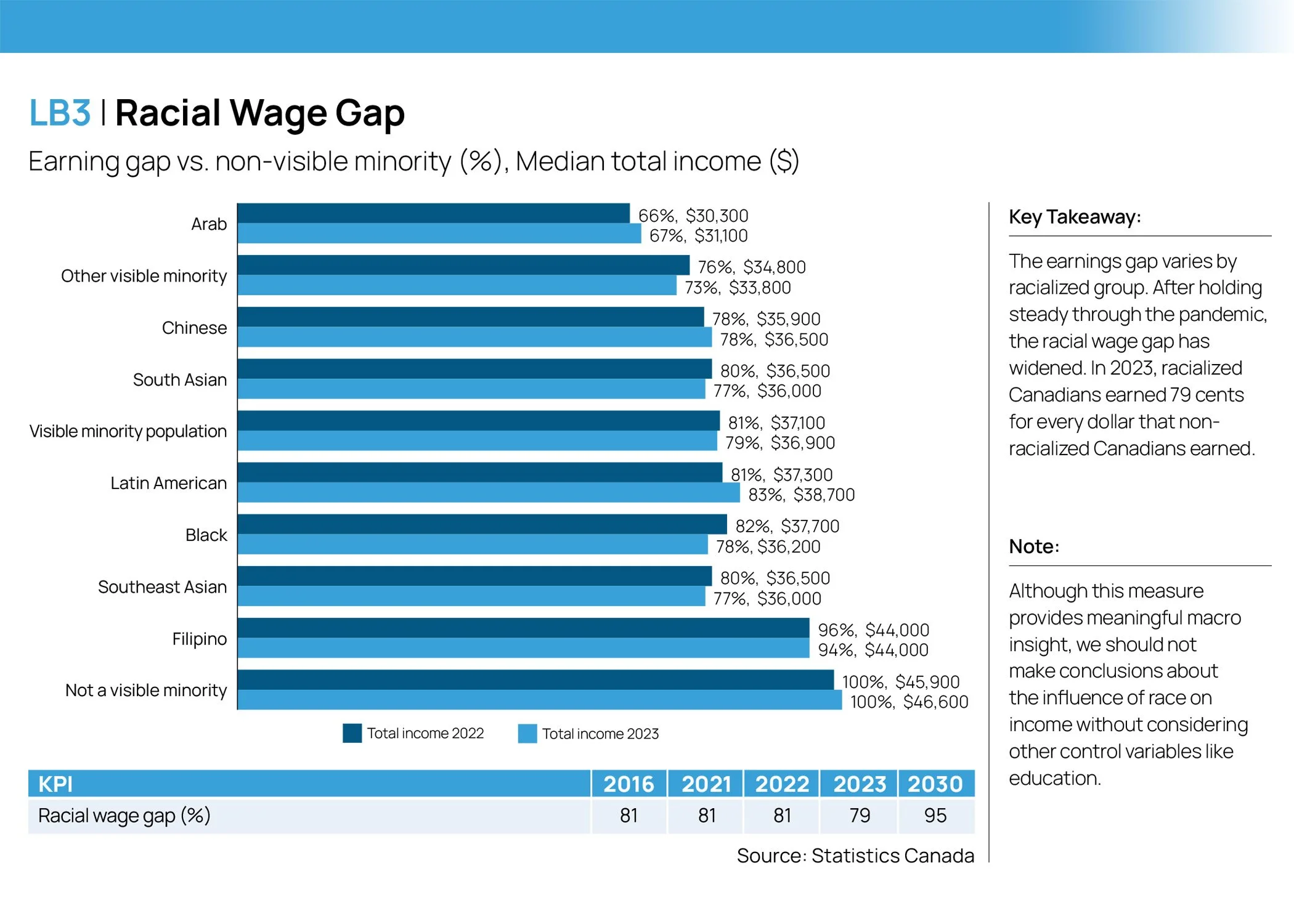 The earnings gap varies by racialized group. After holding steady through the pandemic, the racial wage gap has widened. In 2023, racialized Canadians earned 79 cents for every dollar that nonracialized Canadians earned.