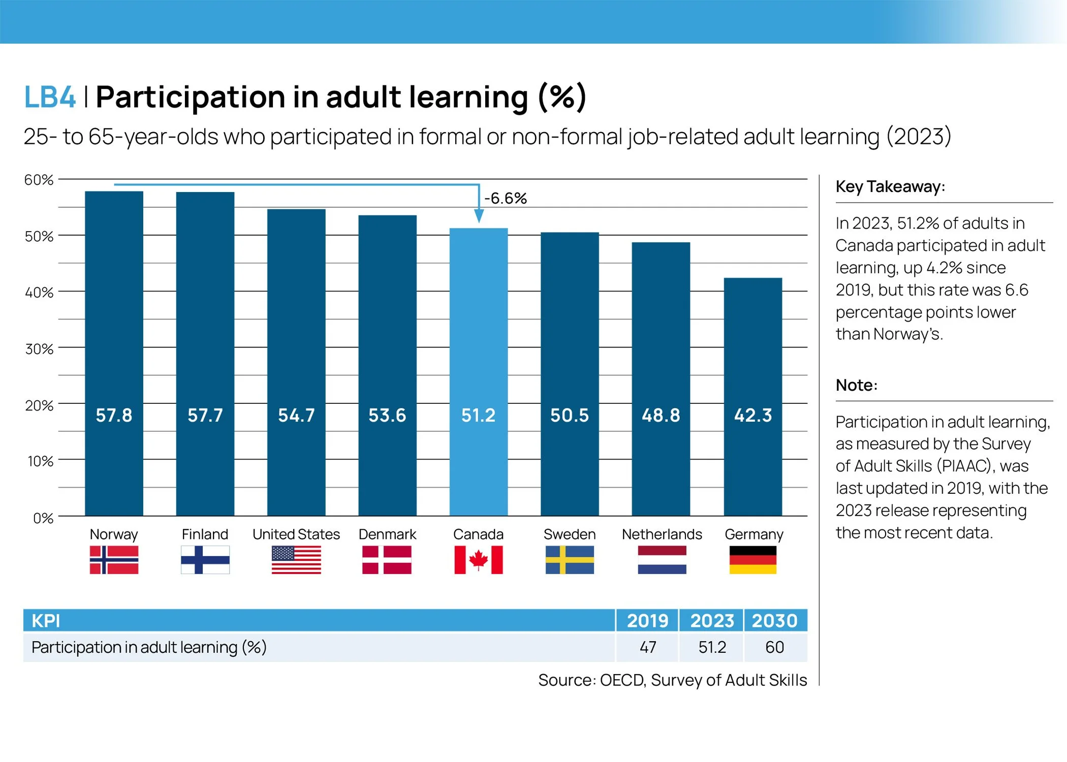 In 2023, 51.2% of adults in Canada participated in adult learning, up 4.2% since 2019, but this rate was 6.6 percentage points lower than Norway’s.