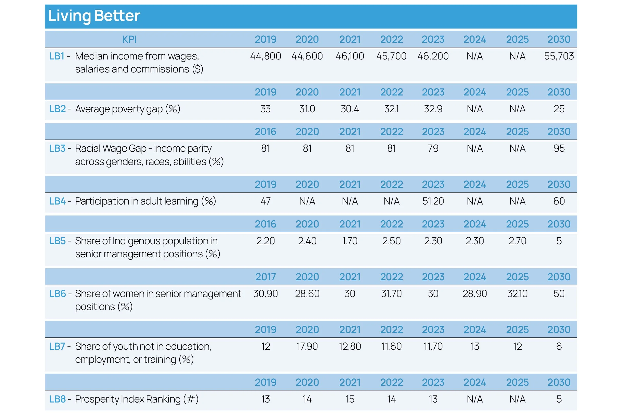 Inclusivity is not just a social goal; it is an economic necessity for innovation. Yet wealth inequality is rising, and systemic gaps persist. The labour market for Indigenous people has shown some improvement in representation due to economic development programs, but the jobless rate remains around 10%—more than three points higher than the national average. The share of Indigenous people in management positions is stuck at 2.7%, about half of our 2030 goal. The share of women in senior management reversed its years-long decline, rising to 32.1%, but is still well short of the Coalition’s 50% target. Racialized employees earn 79 cents for every dollar earned by non-racialized workers.