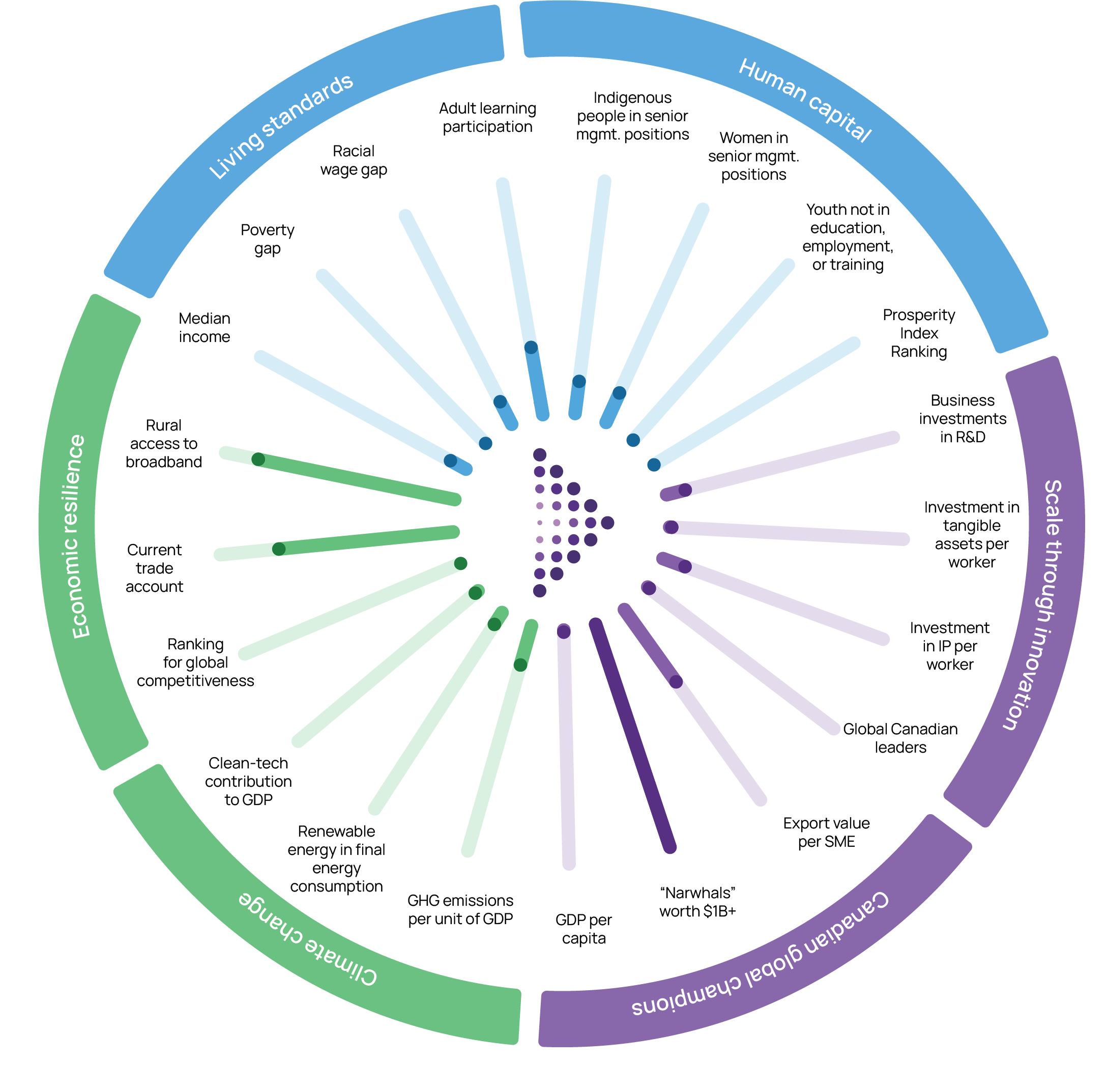 Our scorecard tracks Canada’s progress on key economic, social, and environmental indicators over the next decade. All metrics are internationally accepted indicators of a country’s economic, social and environmental progress.
